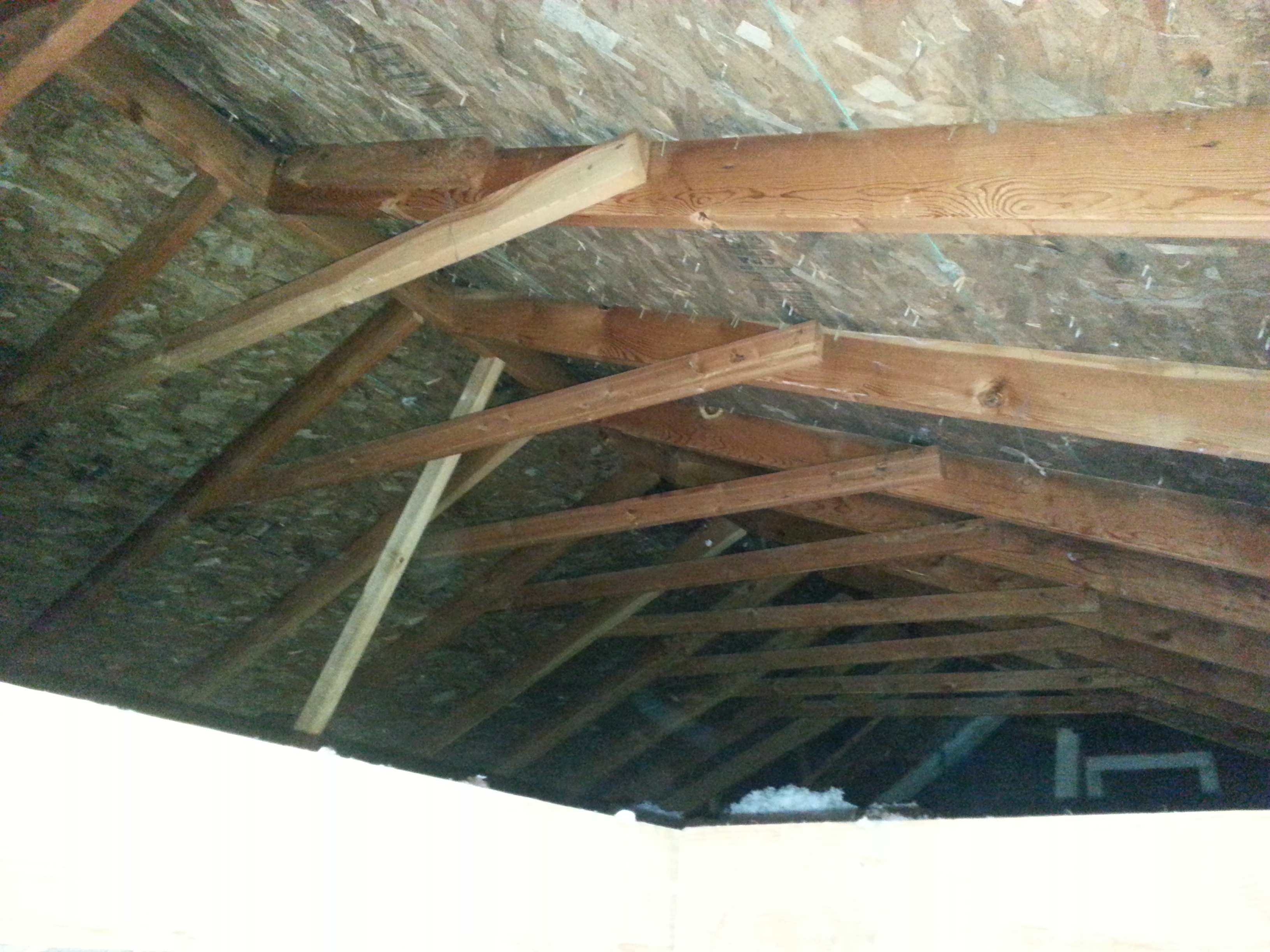 Living room roof. No ridge beam, 1 collar tie and only 2 rafter ties. At least one rafter split and needs replacing. Plus I plan to add collar ties and rafter ties. I still need to research what to do about missing ridge beam.
